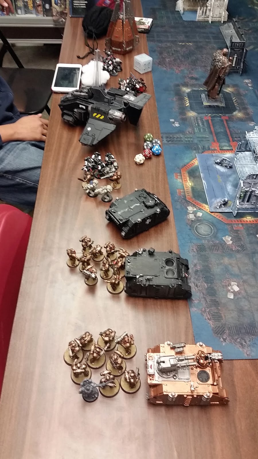Due to the mission special rules, there would be a greater emphasis on board control and holding objectives even when you don't necessarily have a card to score that objective at the moment. This jived well with my swarmy list since I had an abundance of units that could hold objectives, though it also benefited Taher's army since he had a large number of units and transports that could divide and conquer the battlefield - he also held an advantage in that he was running a CAD with objective secured troops choices whereas all of my troops were either from my endless swarm formation (no obsec), or mucolid spores (non-scoring units).